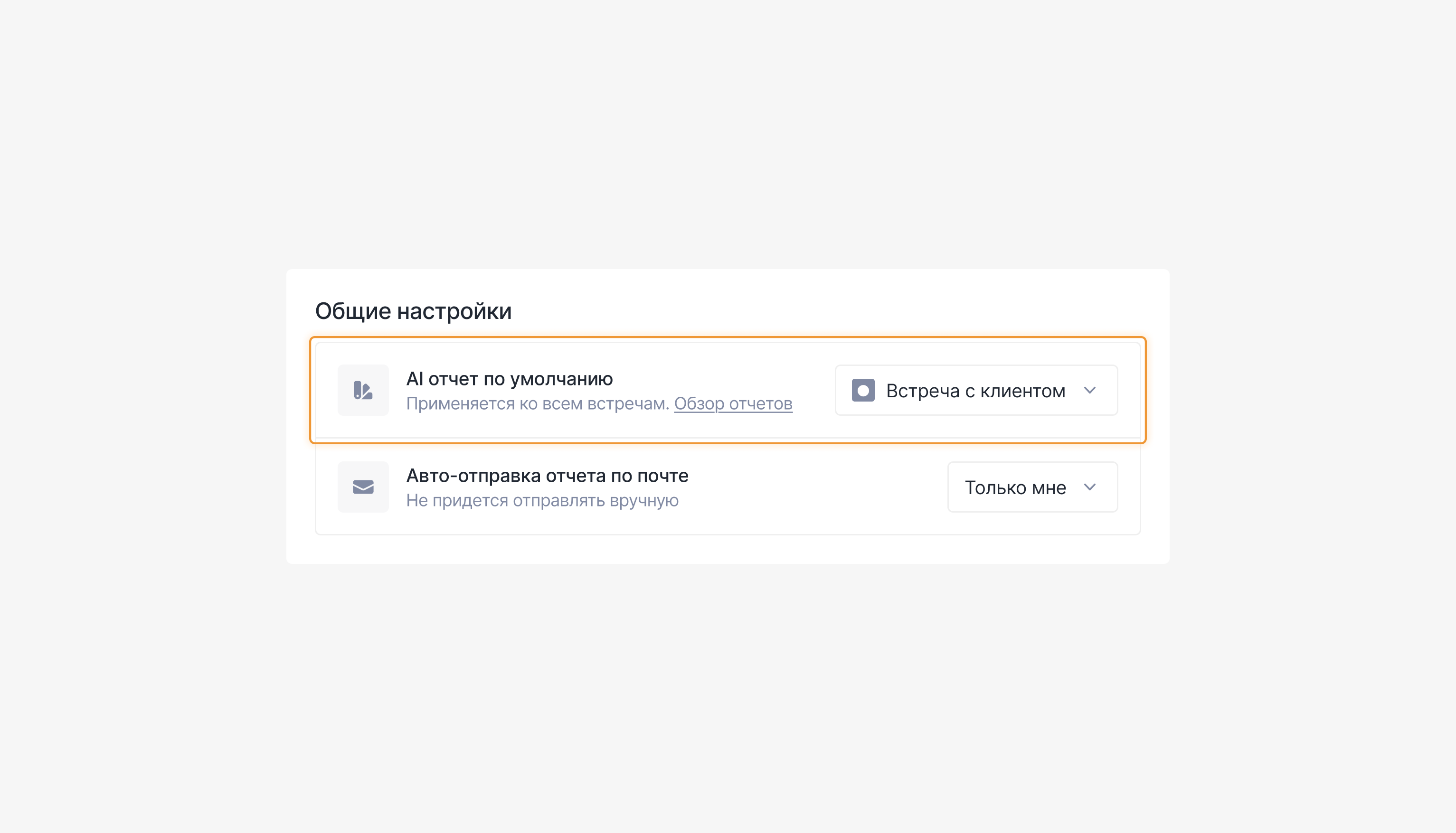Если вы регулярно используете один и тот же формат отчёта (например, «Протокол» или «Встреча с клиентом»), его можно установить по умолчанию для всех новых встреч.