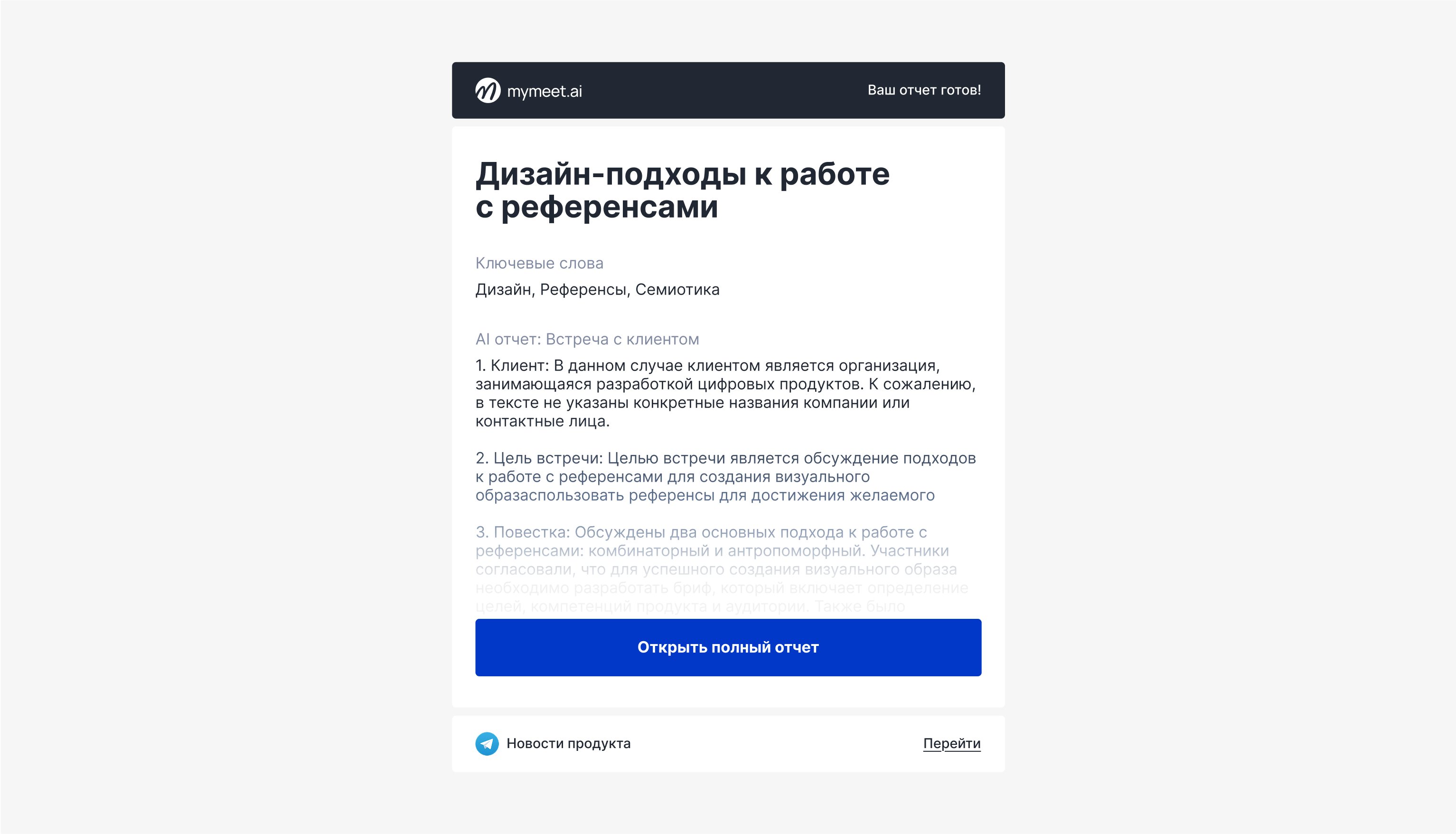После включения этой функции все участники встречи получат отчет на email автоматически через несколько минут после завершения обработки. Отчет придет в формате PDF и будет содержать транскрипт, AI-саммари и выделенные задачи.