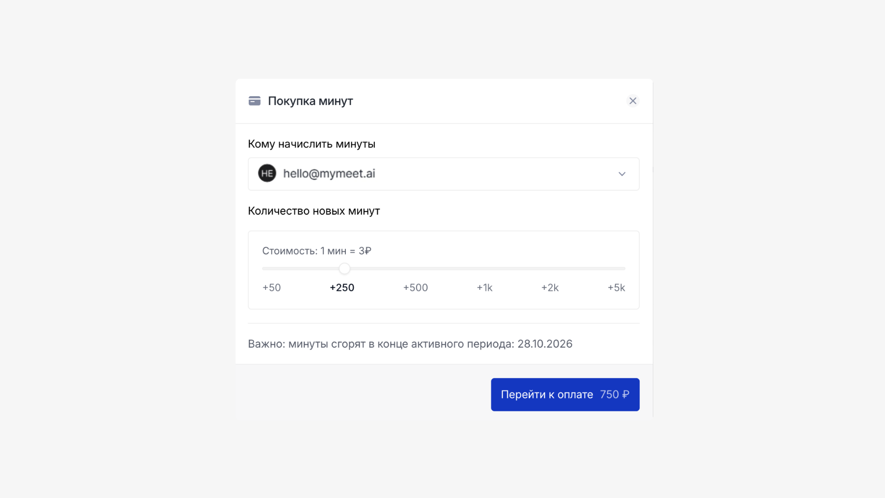 Чтобы купить дополнительные минуты, перейдите в раздел "Тариф" в настройках и выберите нужное количество.