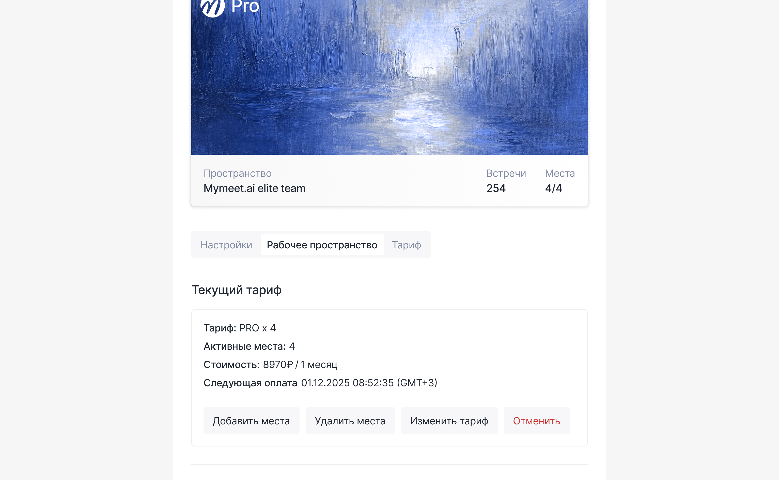 При отмене платного тарифа подписка остается активной до конца оплаченного периода. Все функции и минуты продолжают работать в полном объеме. После завершения оплаченного периода рабочее пространство автоматически переходит на тариф Free со всеми его ограничениями.