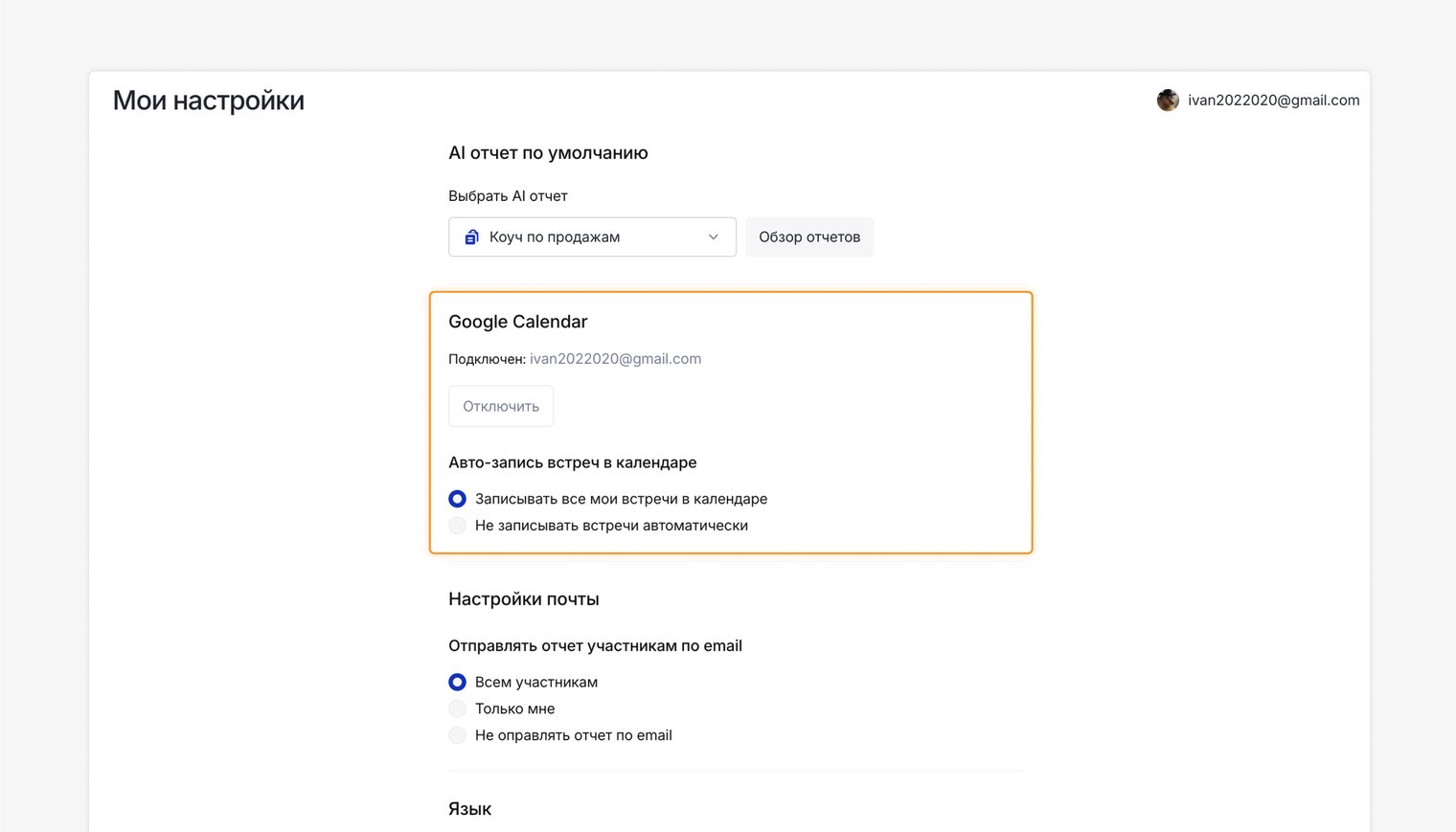 Если хотите подключить другой Google-аккаунт или сменить календарь — сначала отключите текущую интеграцию в "Настройки и интеграции", затем повторно подключите новый аккаунт.