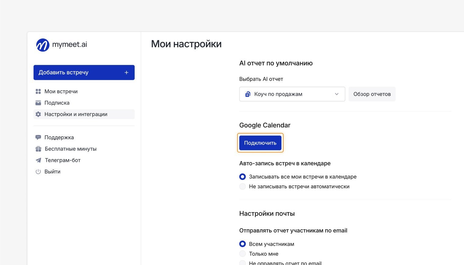 Заново подключите Google Календарь в mymeet.ai