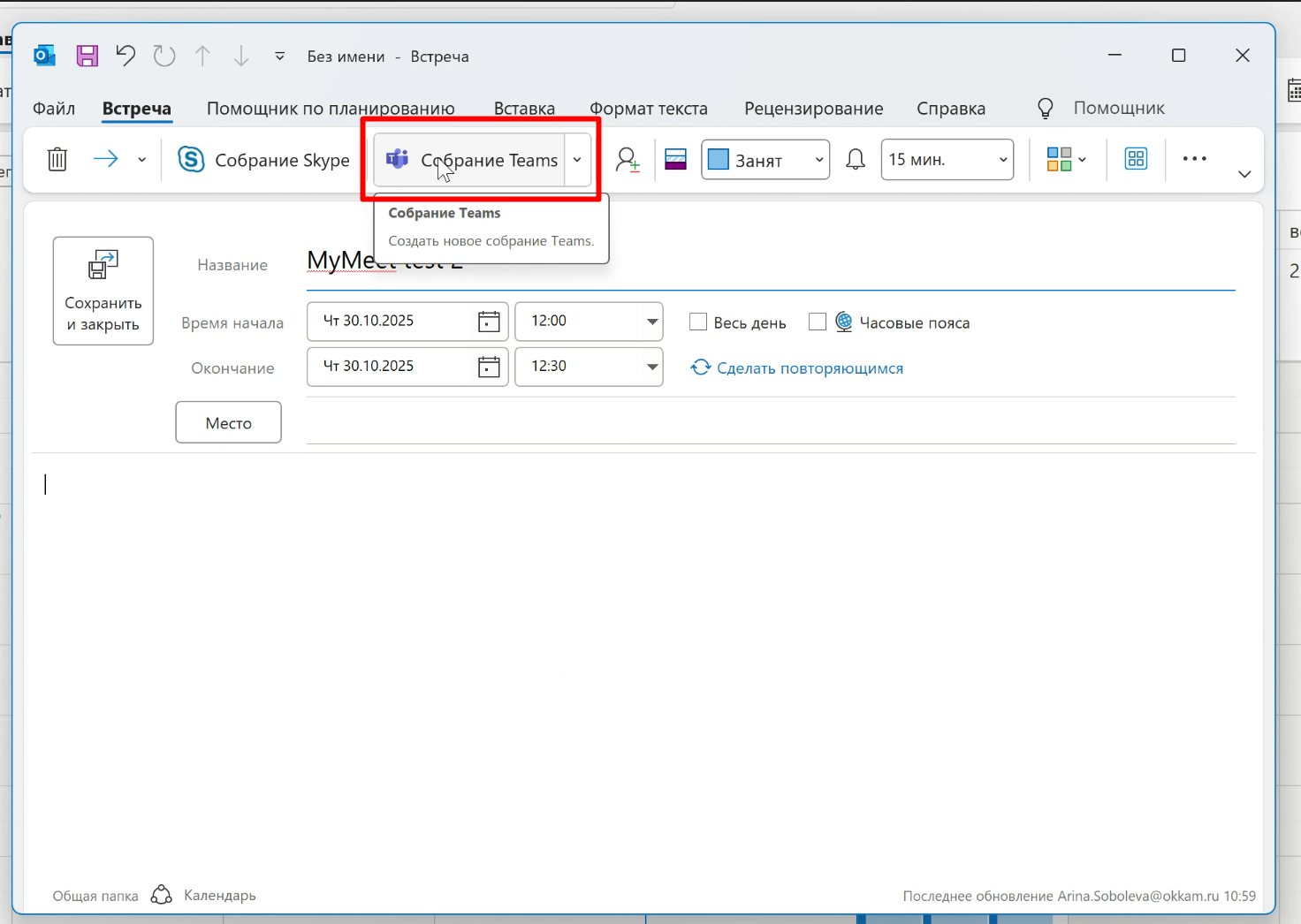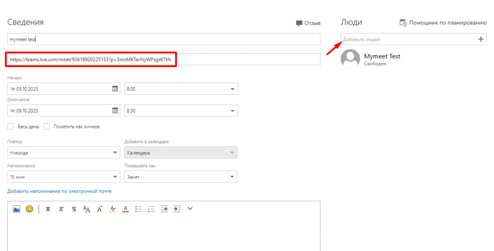 Шаг 2. Введите название, нажмите кнопку “собрание Teams”, чтобы ссылка появилась в теле мероприятия