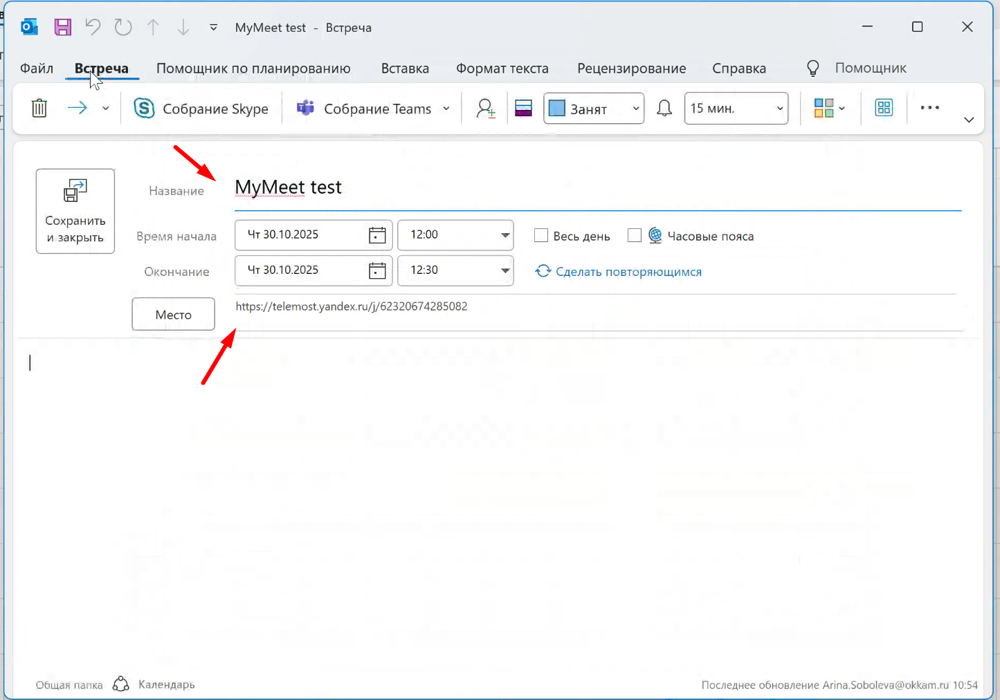 Шаг 2. Введите название, добавьте ссылку на нужную ВКС встречу в поле “место”