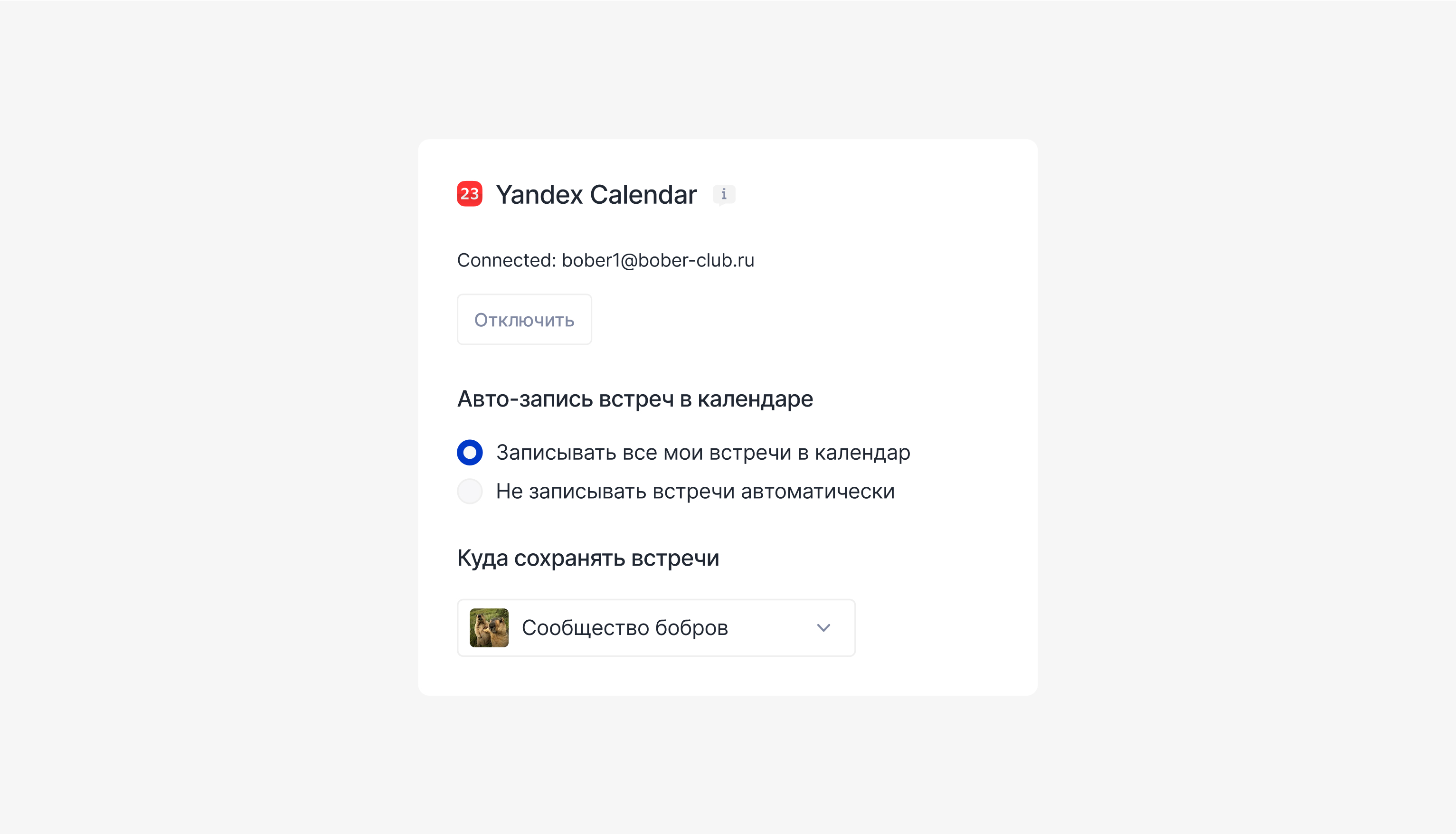 После успешного подключения включите "Авто-запись встреч" → "Записывать все мои встречи в календаре". Без включения этого ползунка автоматическая запись работать не будет.