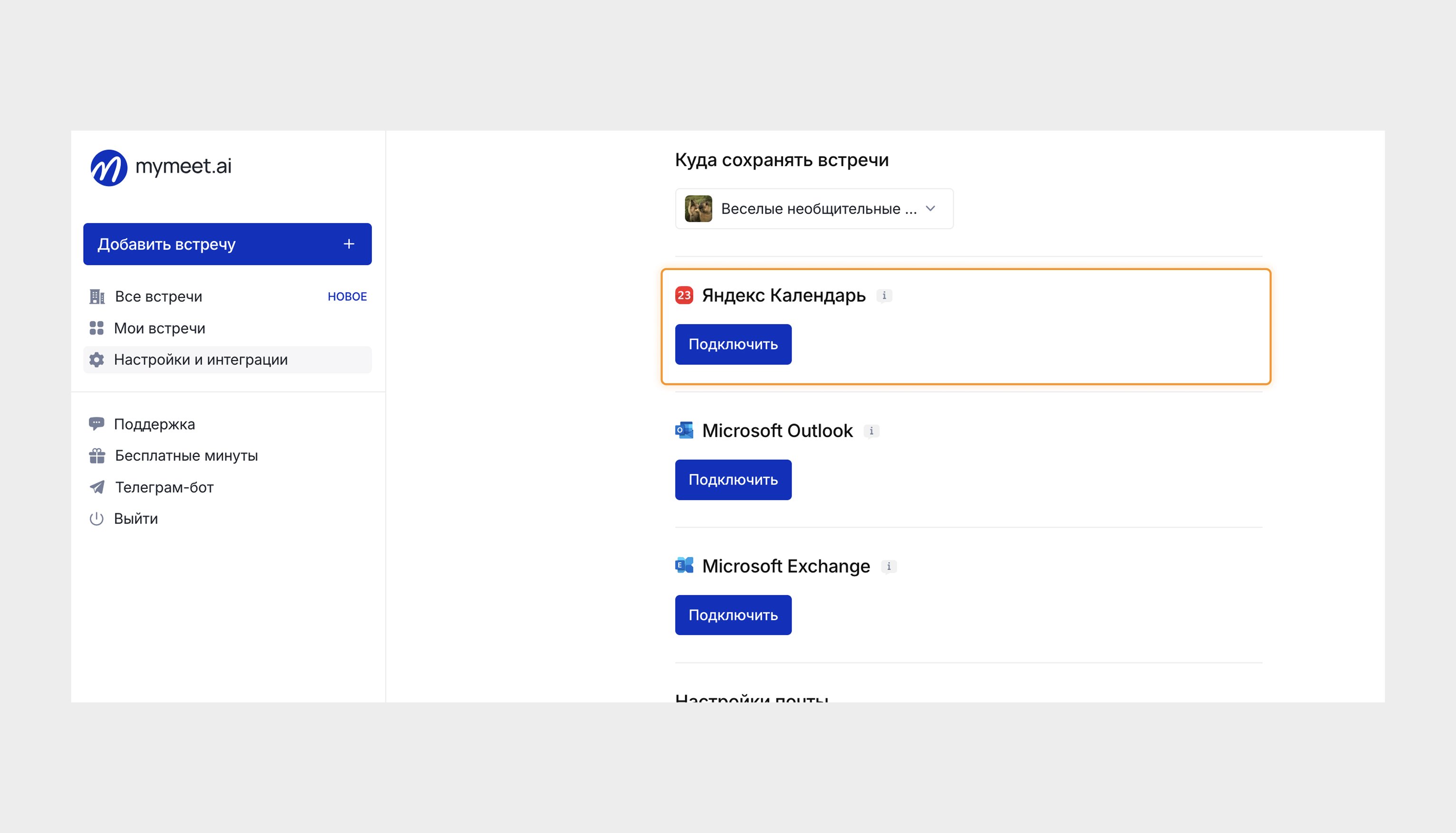 Если у вас подключено несколько рабочих пространств, вы можете выбрать, в какое из них будут сохраняться встречи, записанные через интеграцию с Яндекс Календарём.