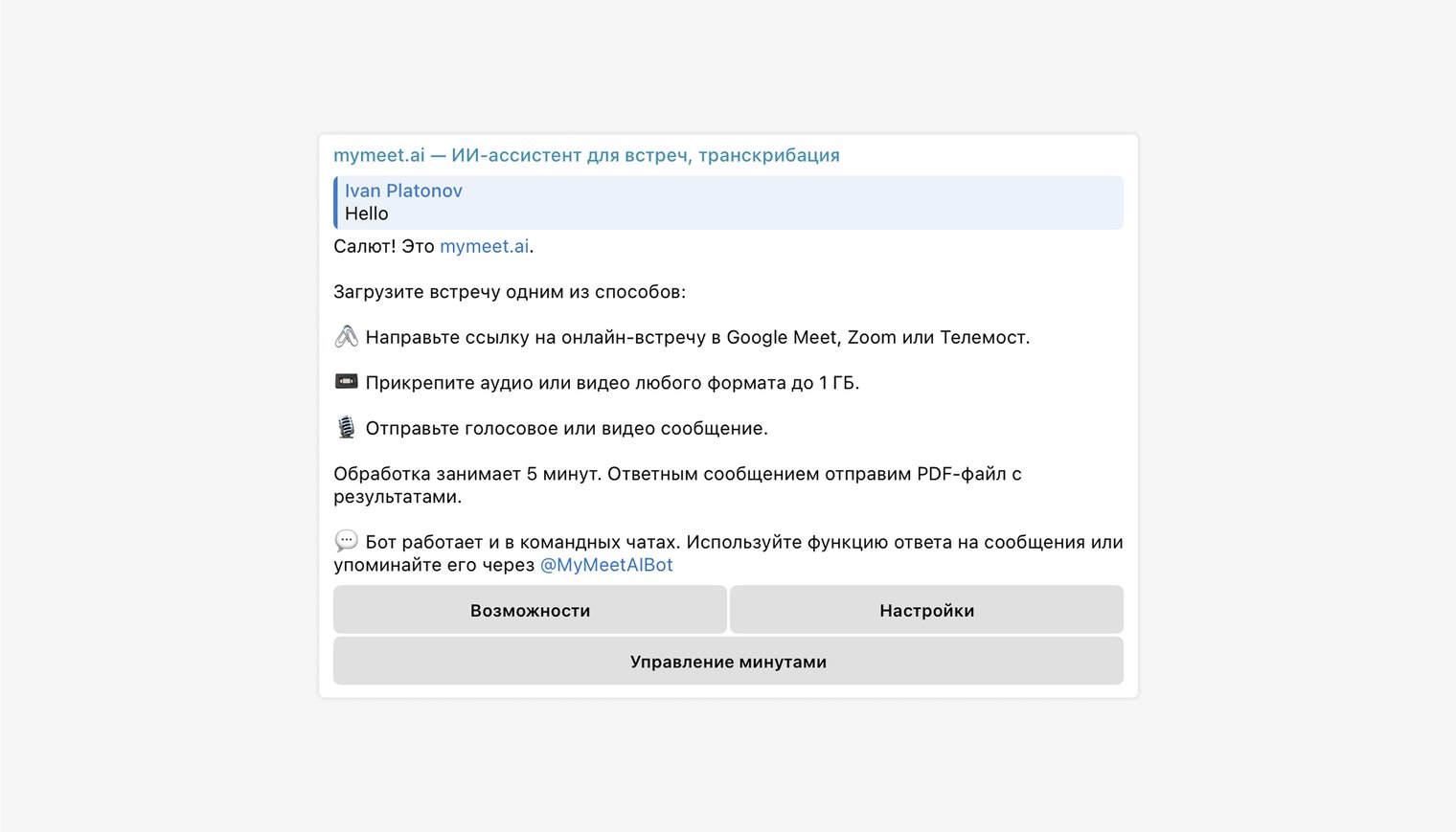 После запуска бот покажет стартовое меню с базовыми функциями. Базовые возможности доступны сразу вместе с 90 минутами для обработки, но рекомендуем привязать Telegram к профилю на mymeet.ai — это не обязательно, но привязка дает полный доступ к расширенному функционалу веб-версии. Привязка синхронизирует минуты, показывает тариф, позволяет управлять подпиской и сохраняет встречи в личный кабинет.