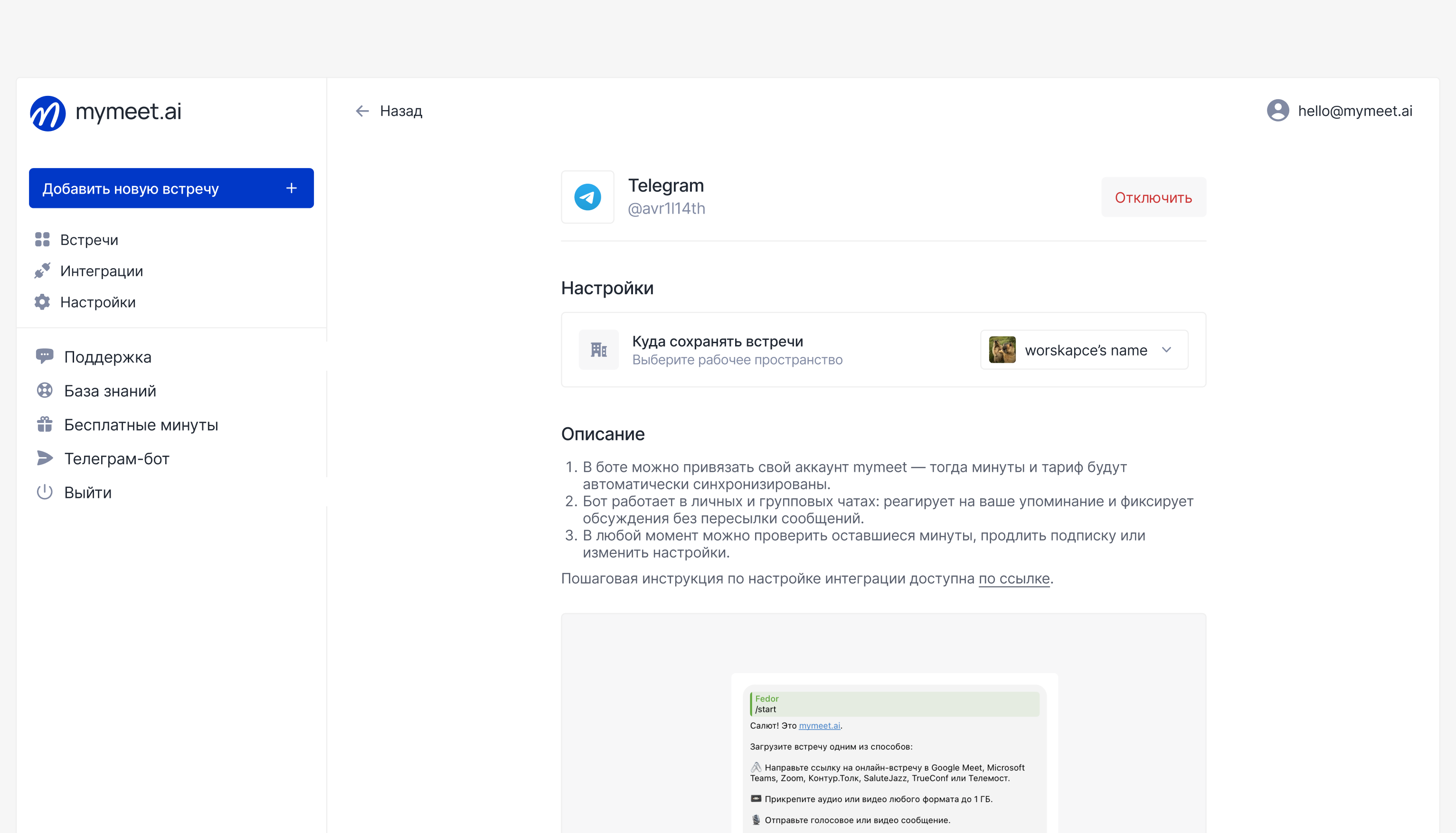 В рамках одного кабинета mymeet.ai можно подключить только один telegram аккаунт. Если хотите подключить другой аккаунт — сначала отключите текущую интеграцию, затем повторно подключите новый.