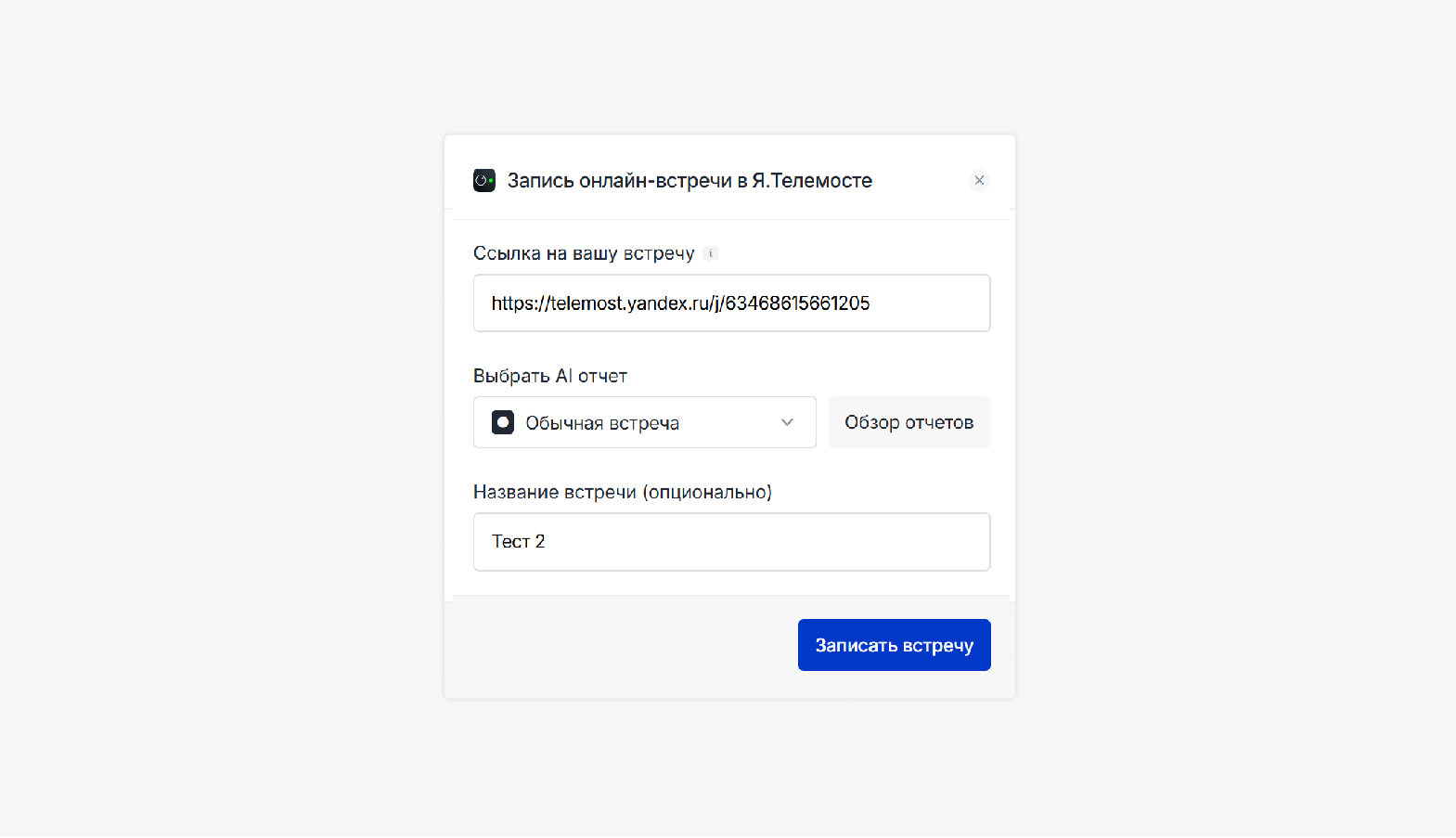 Шаг 4. Нажмите “записать встречу” и бот придет на нее в течение 10-15 секунд.