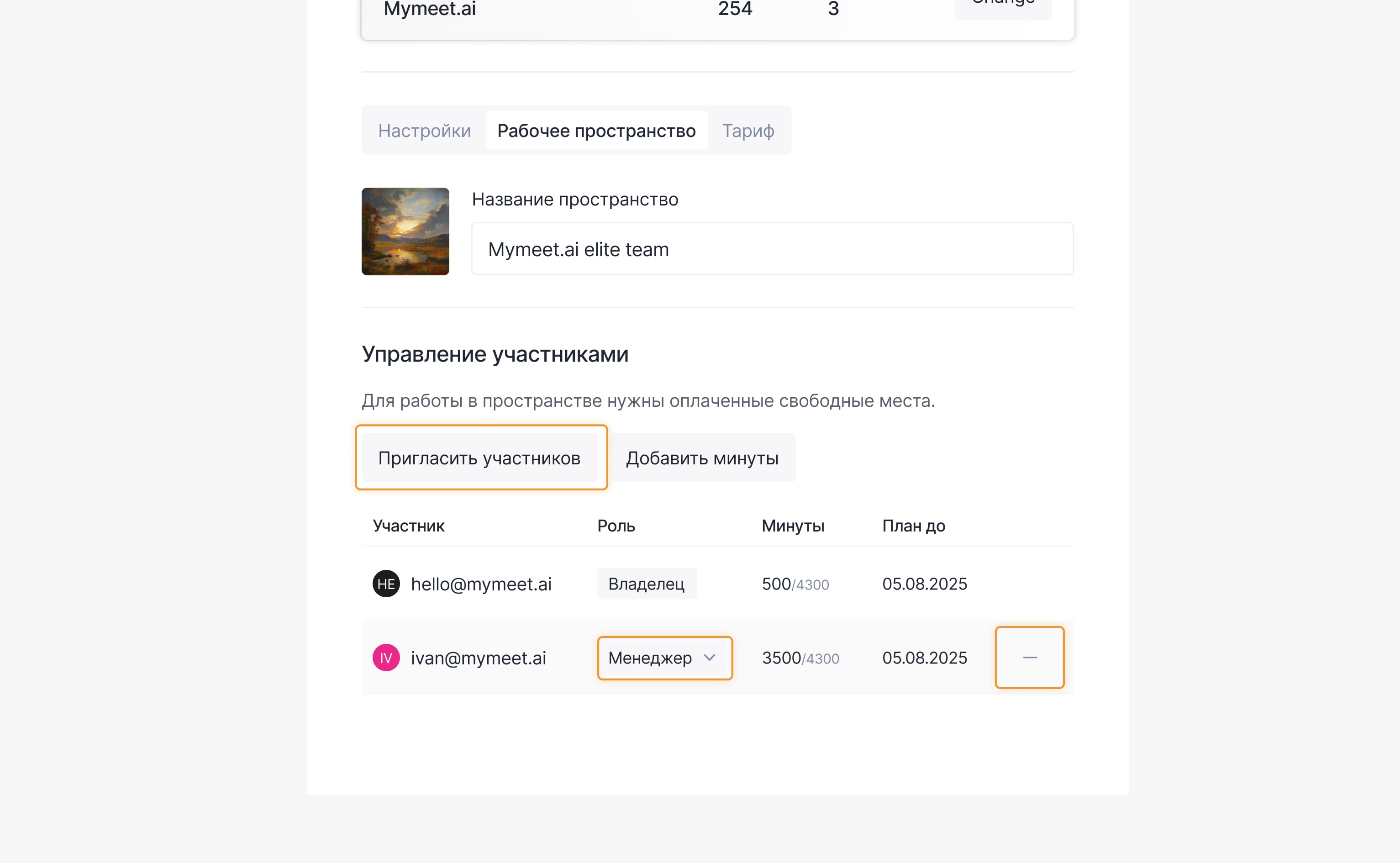Это возможность собрать всех своих коллег, их встречи и отчеты в одном месте. Вы можете назначать роли, доступы и легко контролировать все процессы связанные с mymeet.ai