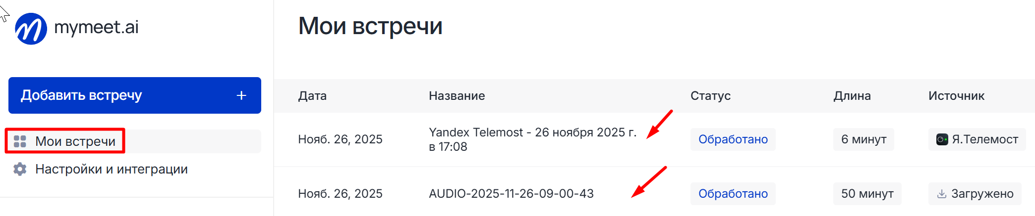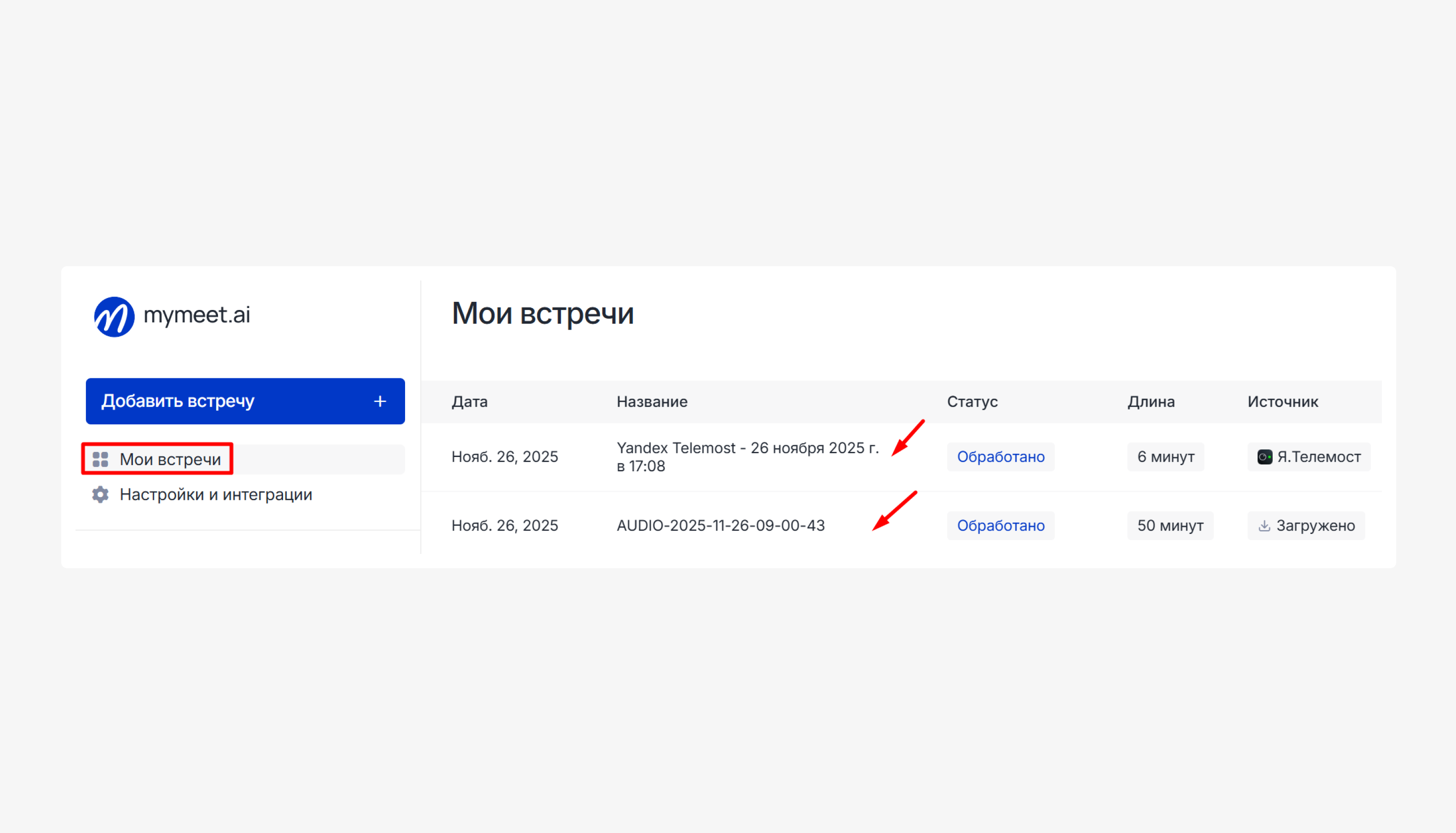 По окончании любой встречи все отчеты падают к вам в личный кабинет маймит. В левой части экрана в блоке “мои встречи” вы можете найти все записи. Чтобы провалиться в любую встречу и получить больше информации — просто нажмите на нужную.