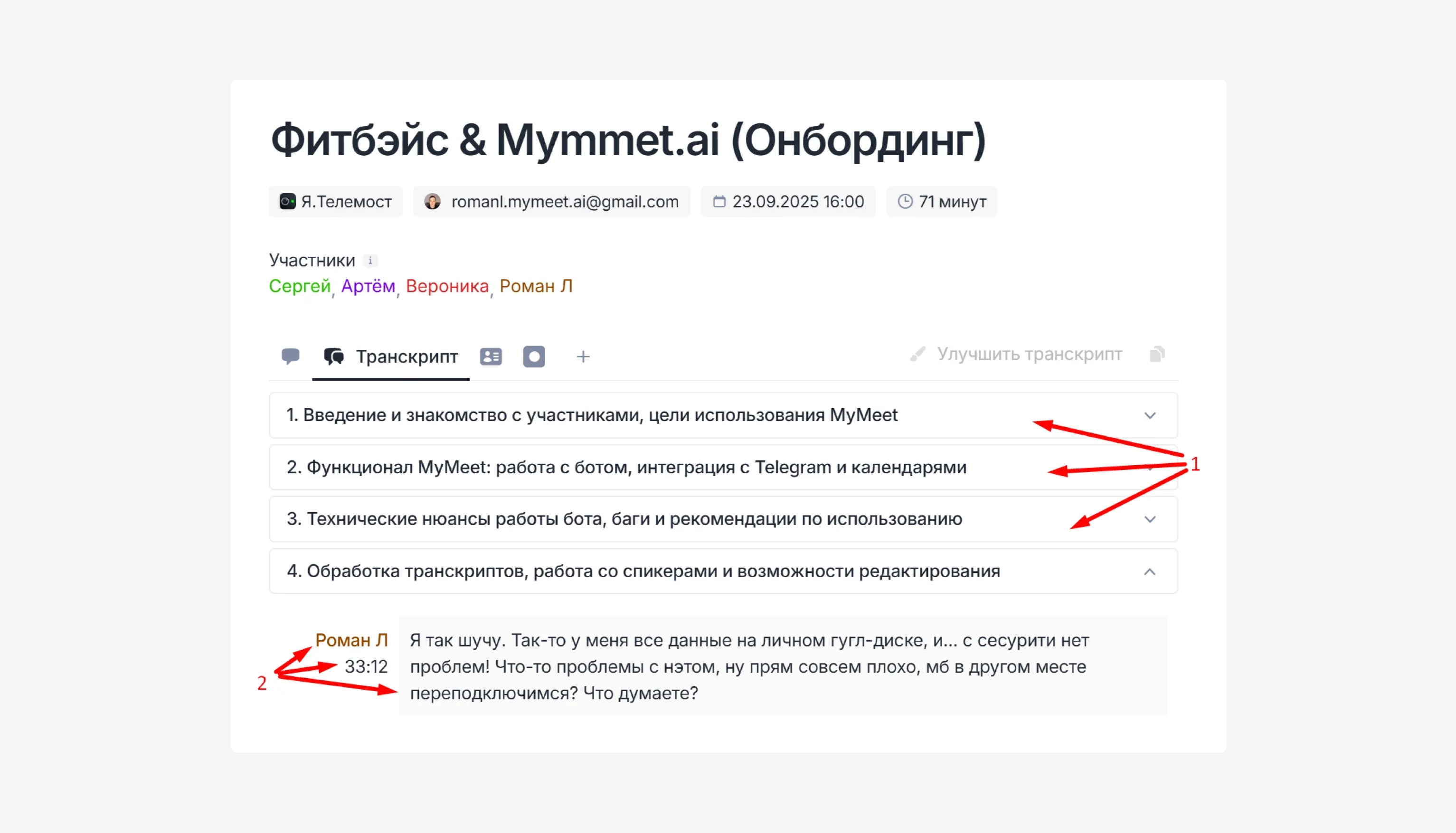 Транскрипт или расшифровка встречи находится во вкладке "Транскрипт". Состоит из умных AI-глав, реплик участников и таймингов.