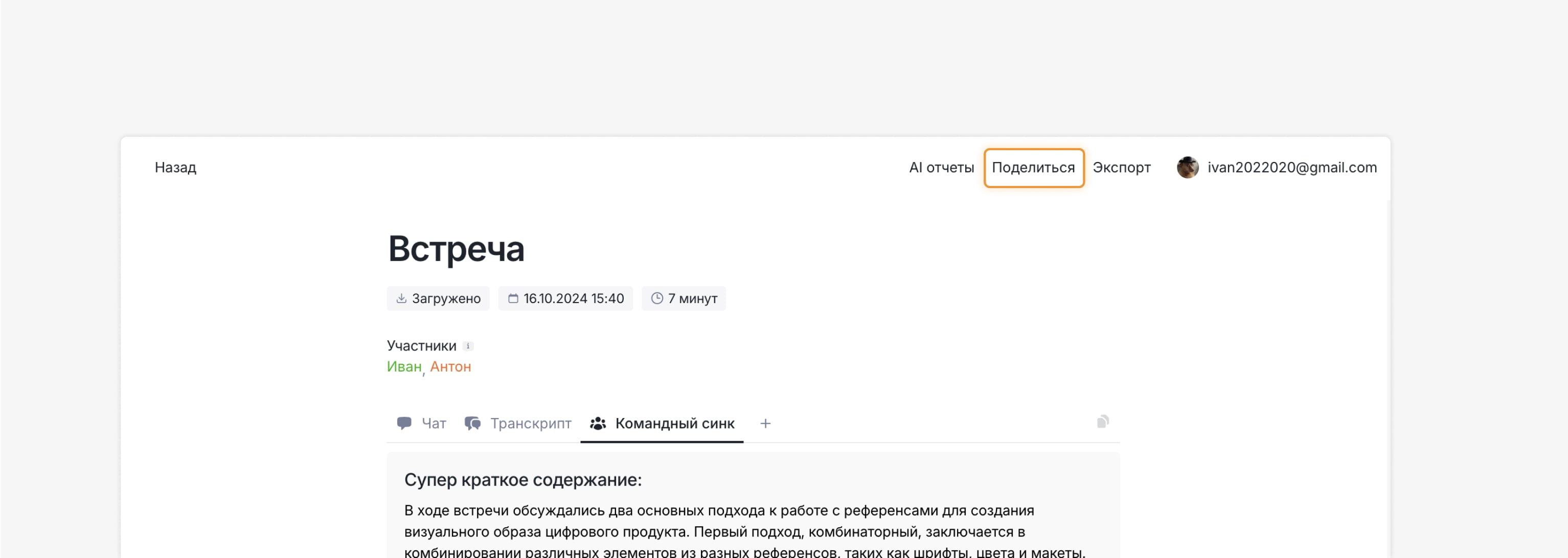 Отчеты могут автоматически отправляться всем участникам встречи сразу после её завершения и обработки. Это особенно удобно для регулярных встреч с командой или клиентами.